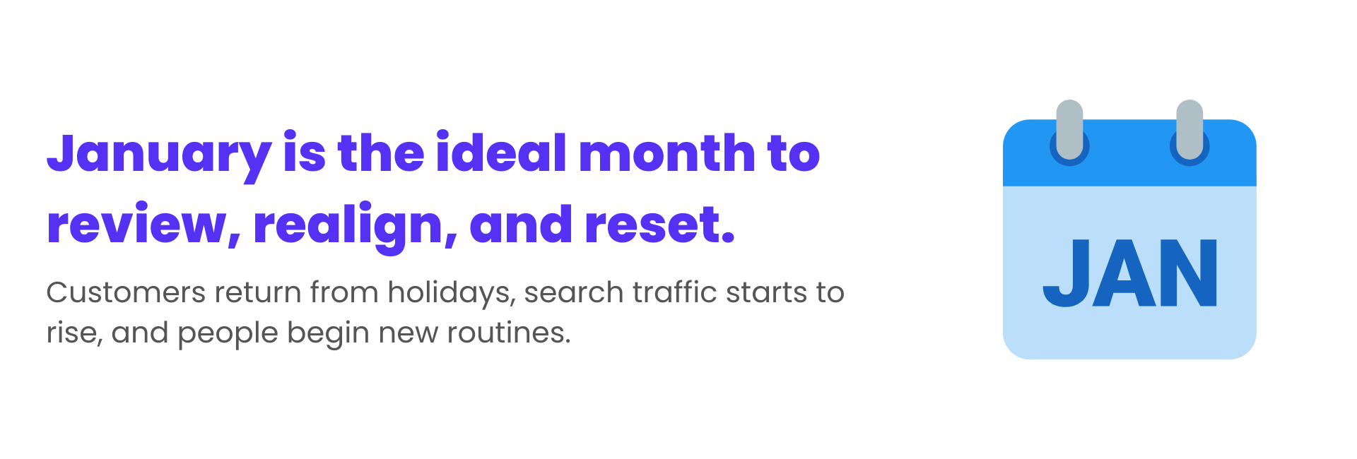 January is the ideal month to review, realign, and reset. Customers return from holidays, search traffic starts to rise, and people begin new routines. This makes early-year marketing uniquely powerful if you approach it with intention.